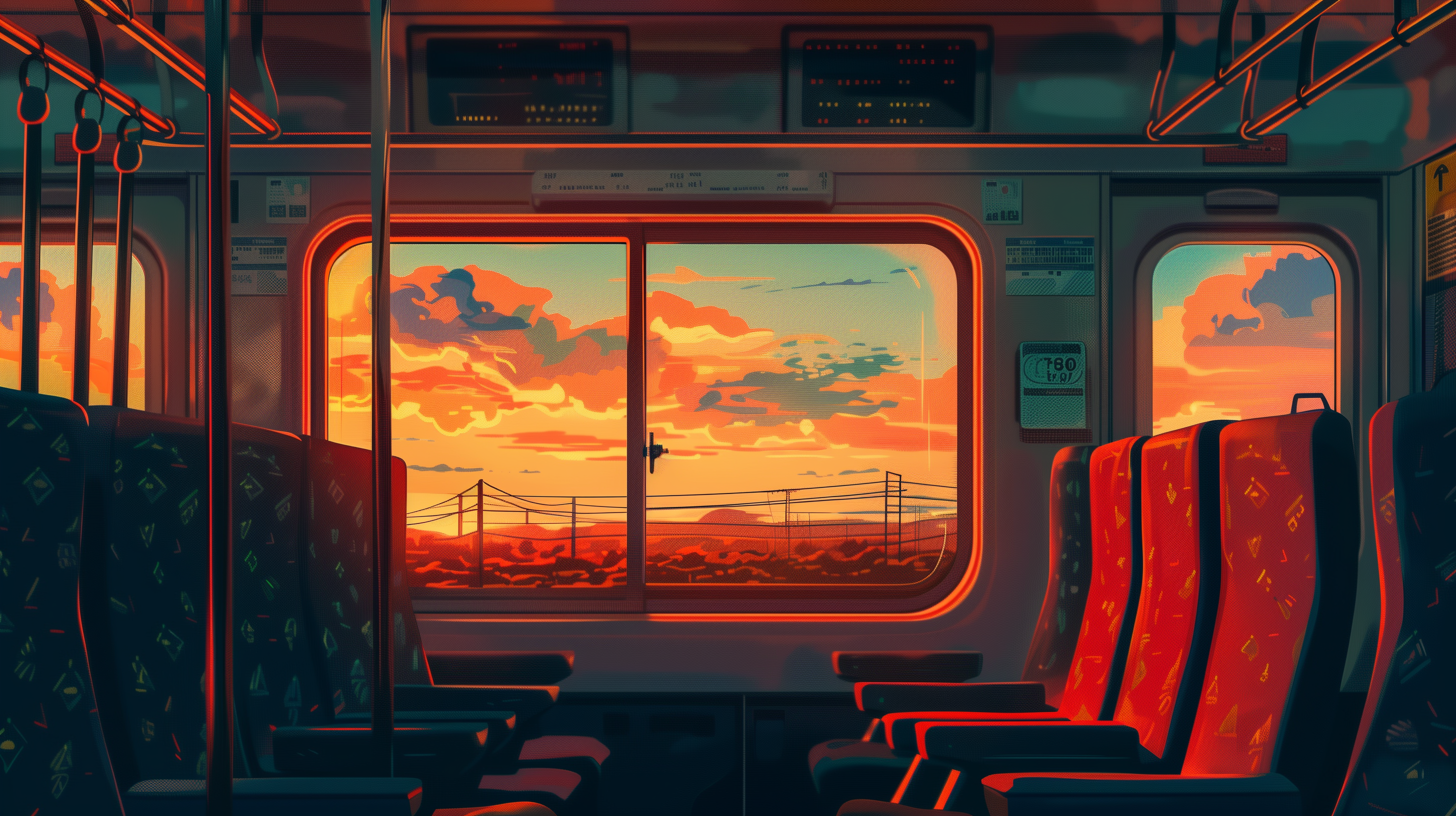 - Prompt: looking out the train window in the city suburbs by alena aenami, pov, you can see the seats in front of you